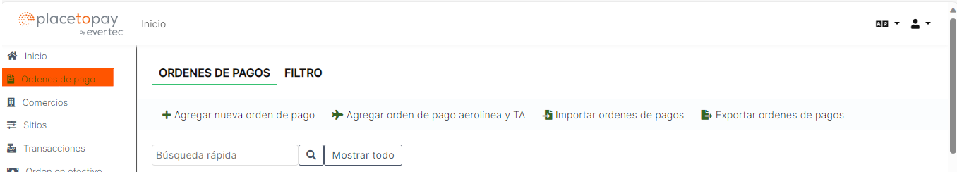 Una vez ingrese al panel administrativo, diríjase al aparte de Órdenes de pago.