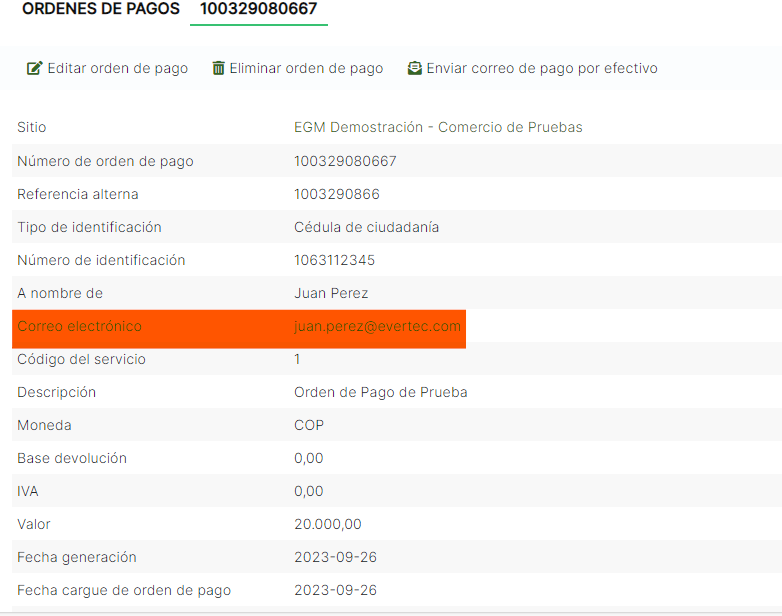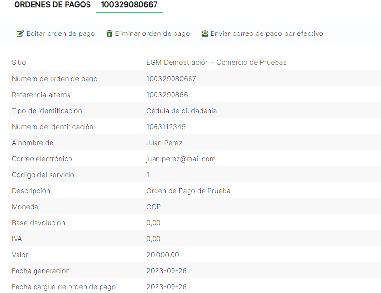 Luego el sistema nuevamente mostrará los datos ya actualizados de la orden de pago.